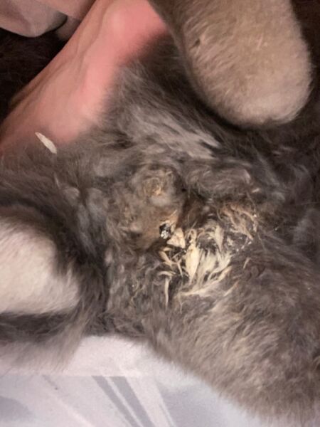• Incontinencia por enfermedades de la vejiga, como cistitis o acumulación de sedimento vesical (“barro vesical”), que pueden provocar apelmazamiento del pelo y adherencias. → Una radiografía puede ayudar a diagnosticar estas afecciones. En algunos casos también es necesario realizar un análisis de orina.