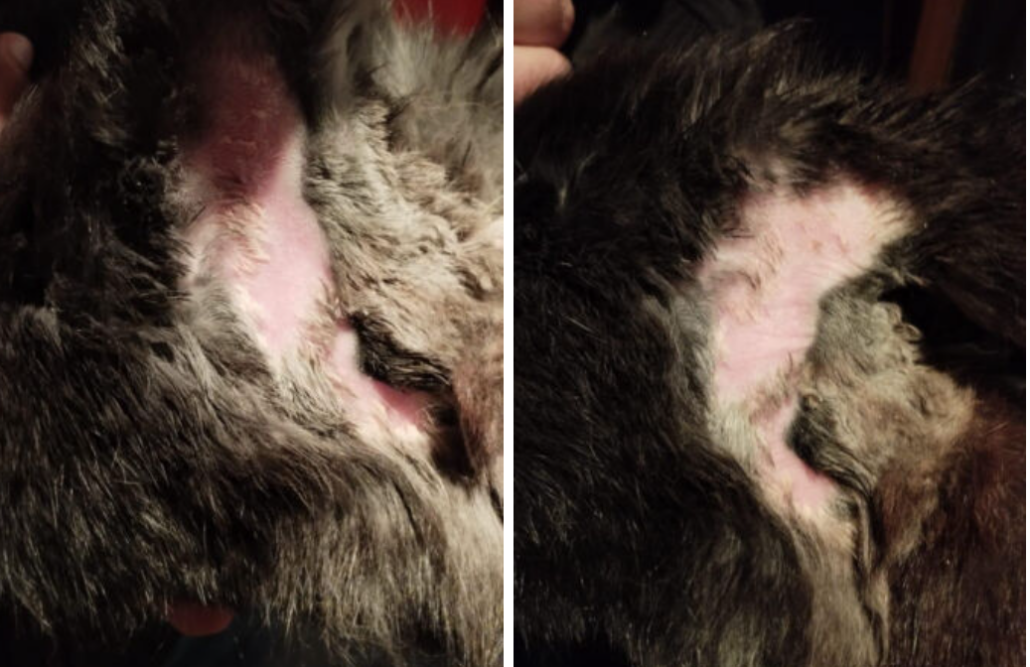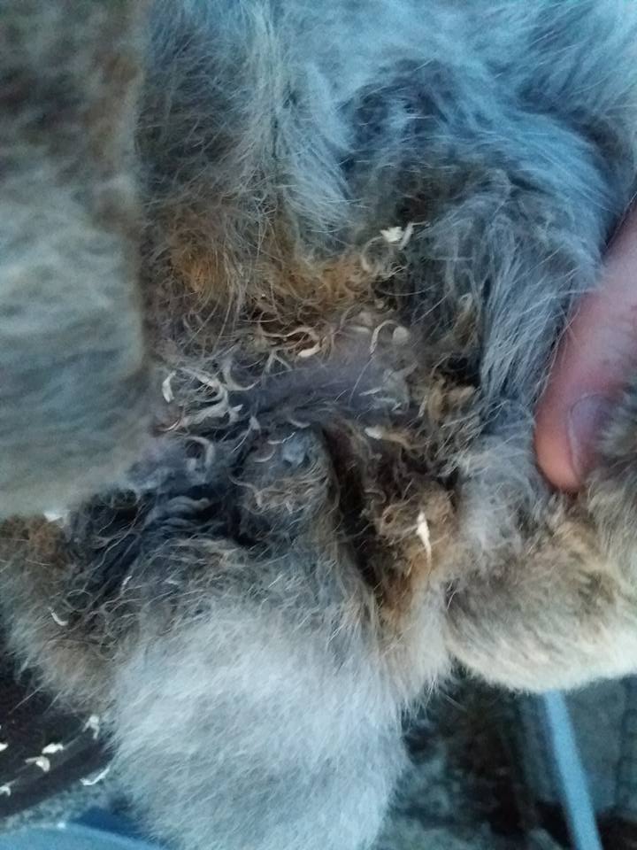Parvus tiene el pene desviado, por lo que se orinaba encima. Manteniendo el pelo corto y utilizando RoboCare Purexam (dejándolo actuar unos minutos), hoy ya no presenta inflamaciones en la piel ni pérdida de pelo.