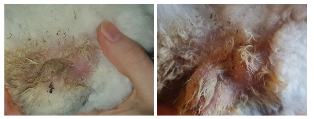 Vulva desviada, por lo que la coneja se moja con orina. También se moja la pata: