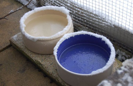 Ofrecer nieve en un cuenco, además del agua, puede ser útil: muchos conejos la comen cuando el agua está congelada.En casetas con calefacción también puede colocarse el agua.