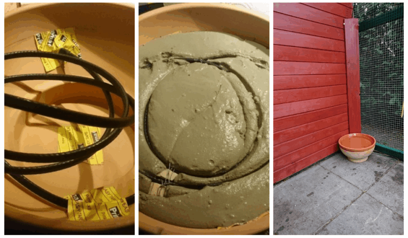 El cable calefactor se incrusta en la superficie con cemento, y encima se coloca un recipiente que se llena con agua.