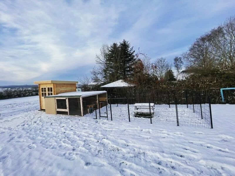Una caseta de jardín con un recinto en el suelo como refugio nocturno y, durante el día, un área de ejercicio en la nieve cercada con una valla para cachorros: de esta manera, o de una forma similar, los conejos pueden vivir al aire libre durante todo el año, incluso en invierno.