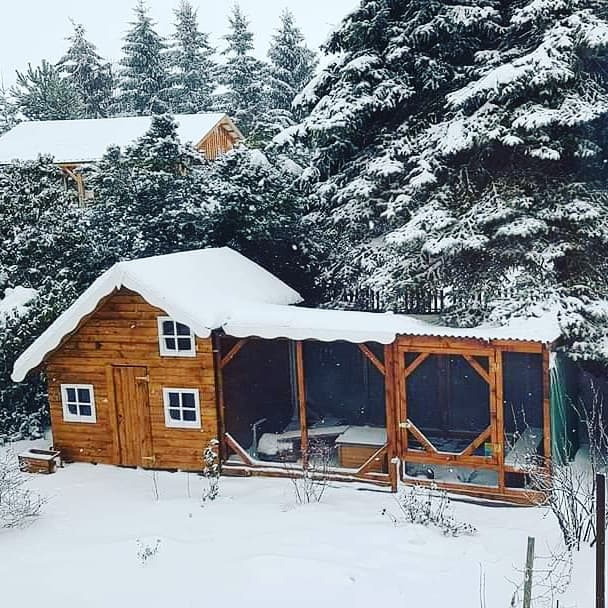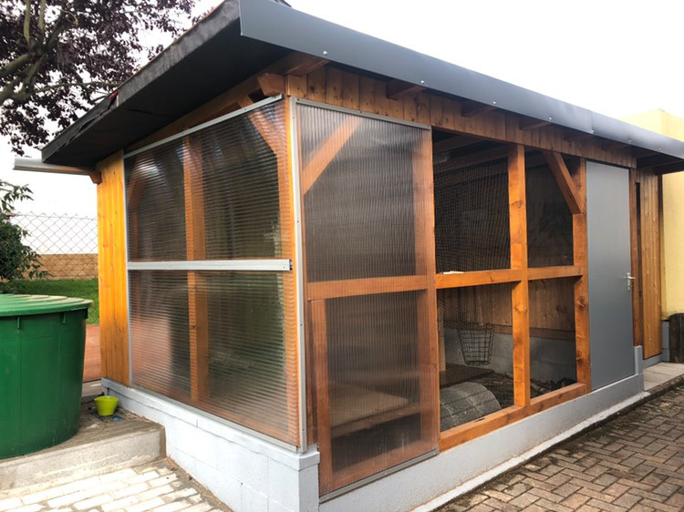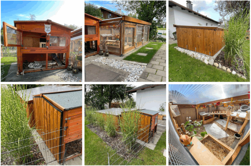Las casas que se venden, pueden servir como refugio si, durante las heladas, se cubre la malla y se coloca una capa gruesa de sustrato en el interior. Sin embargo, a menudo es necesario reforzar el techo, la malla o las paredes traseras delgadas para que sean seguras frente a depredadores. Es absolutamente imprescindible que haya un recinto exterior permanente y a prueba de martas; de lo contrario, los conejos prácticamente viven dentro de un congelador.