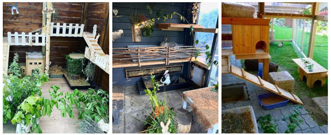 Los conejos necesitan, además de zonas de sol y sombra, protección frente a la humedad, el viento, las corrientes de aire, la nieve y la lluvia. Incluso con mal tiempo, deben poder moverse con normalidad. Por ello, es recomendable incorporar al recinto una caseta de jardín o un refugio amplio, o bien cubrir una parte del recinto.