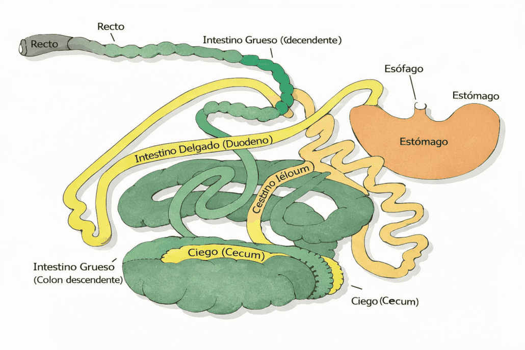 - estructura idéntica del estómago, intestino delgado, ciego y colon